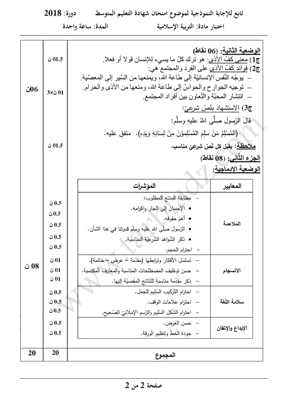 التصحيح النموذجي لموضوع التربية الإسلامية شهادة التعليم المتوسط 2018 مدونة التربية والتعليم